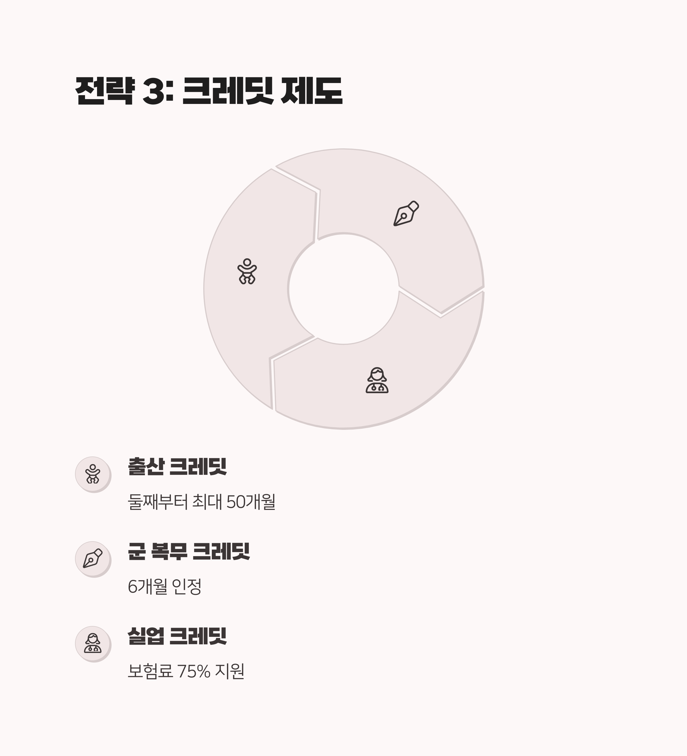 참고로 출산 크레딧과 군 복무 크레딧은 연금개혁을 통해 확대될 가능성이 있어요. 첫째 아이부터 자녀당 12개월씩 크레딧을 부여하거나, 군 복무 전 기간에 대해 지원하는 방식이 논의 중입니다.