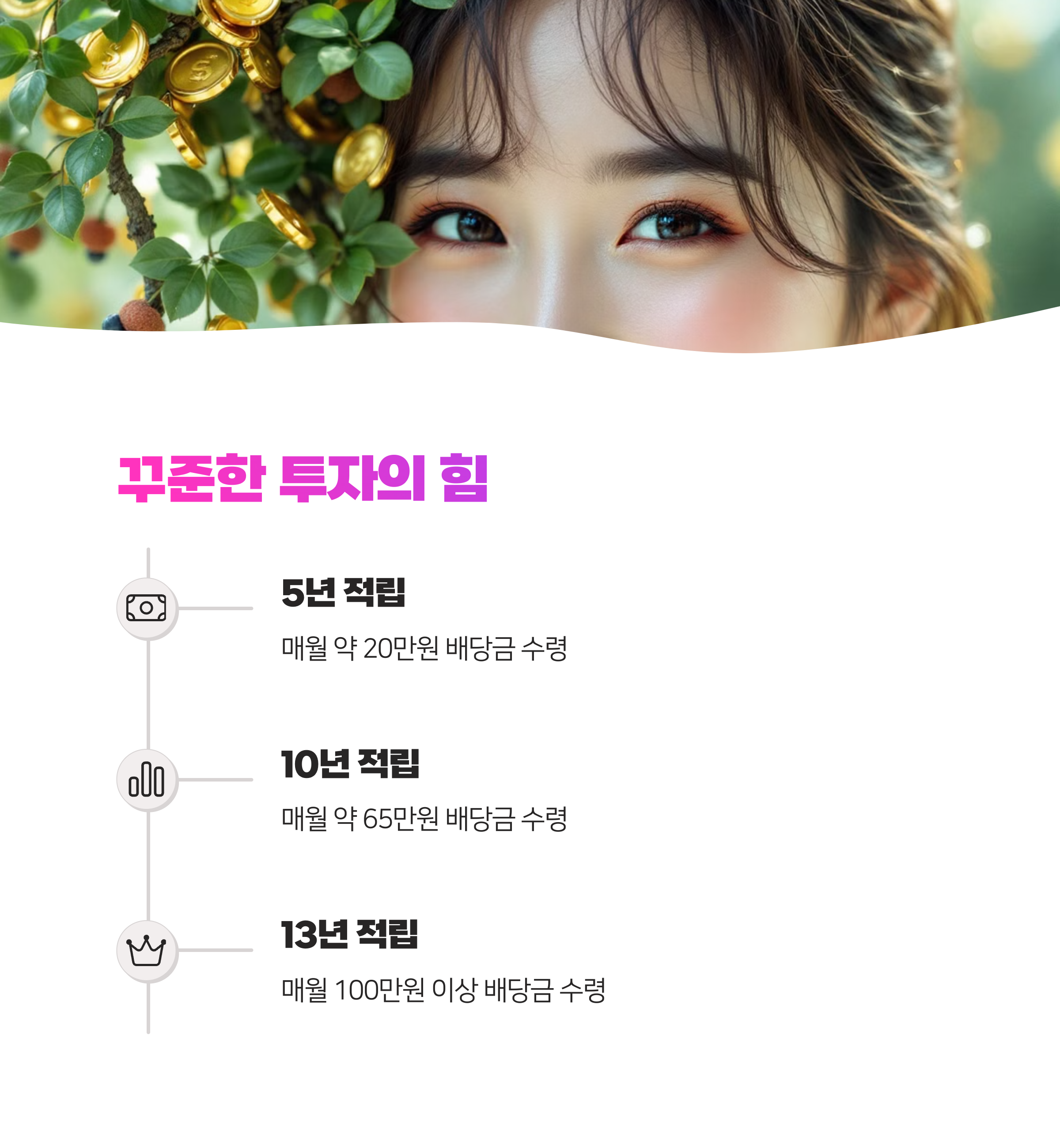 • 13년 적립 시: 매월 약 100만원 이상의 배당금 수령 가능
