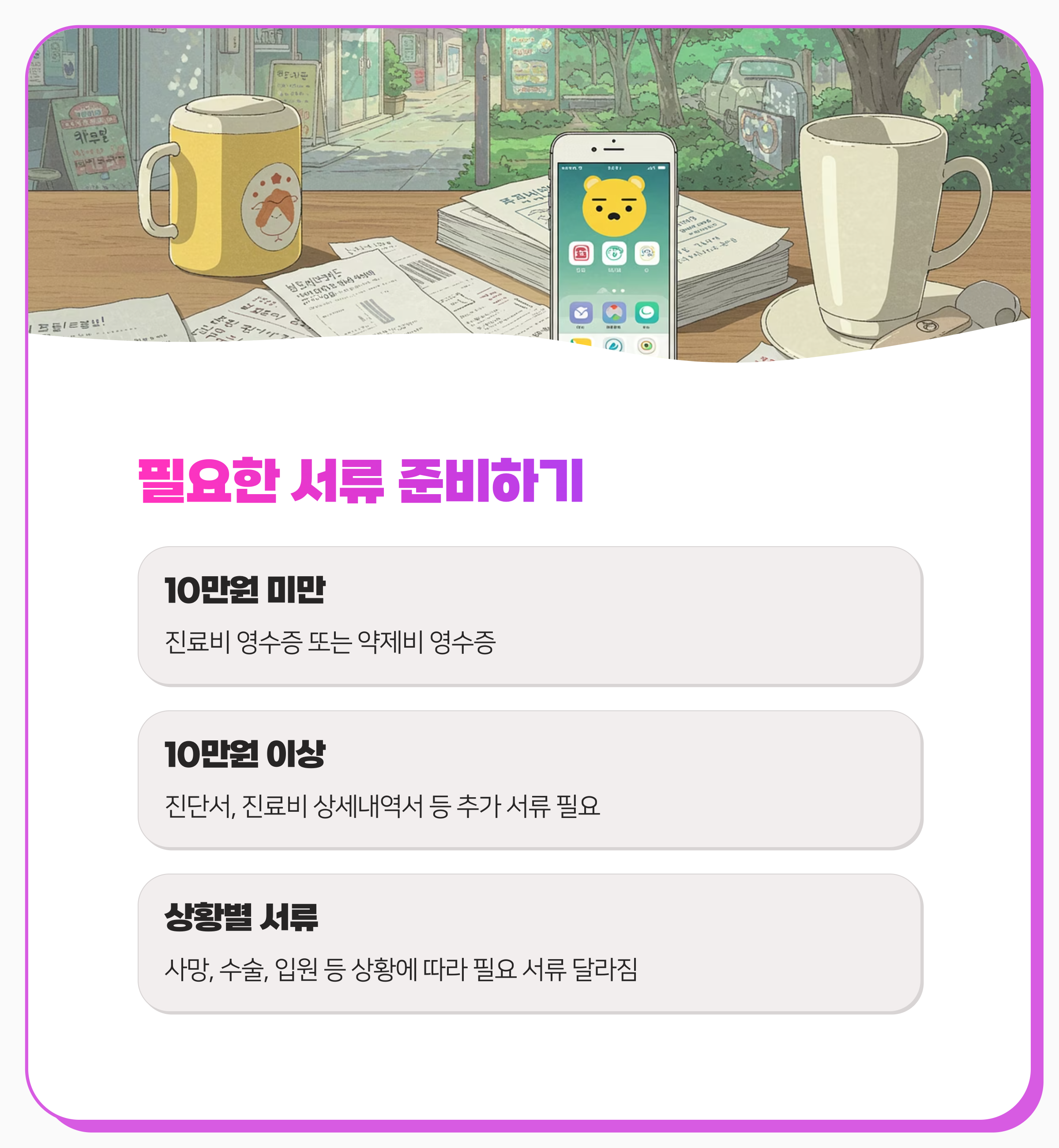 • 10만원 이상: 진단서 + 진료비 상세내역서