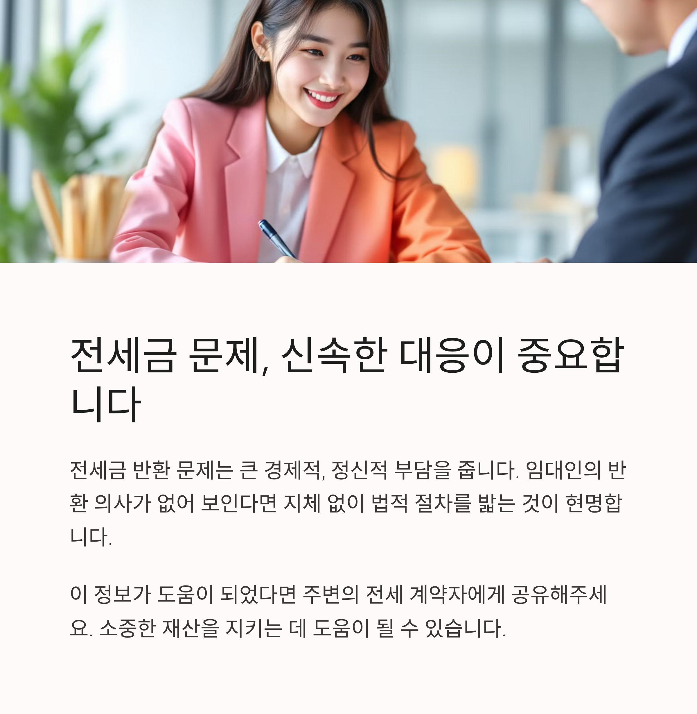 전세금 반환 문제는 세입자에게 큰 경제적, 정신적 부담을 줄 수 있어요. 문제가 발생했을 때 신속하게 대응하고, 필요하다면 전문가의 도움을 받는 것이 중요합니다. 임대인이 보증금 반환 의사가 없어 보인다면 지체 없이 법적 절차를 밟는 것이 현명한 선택입니다.