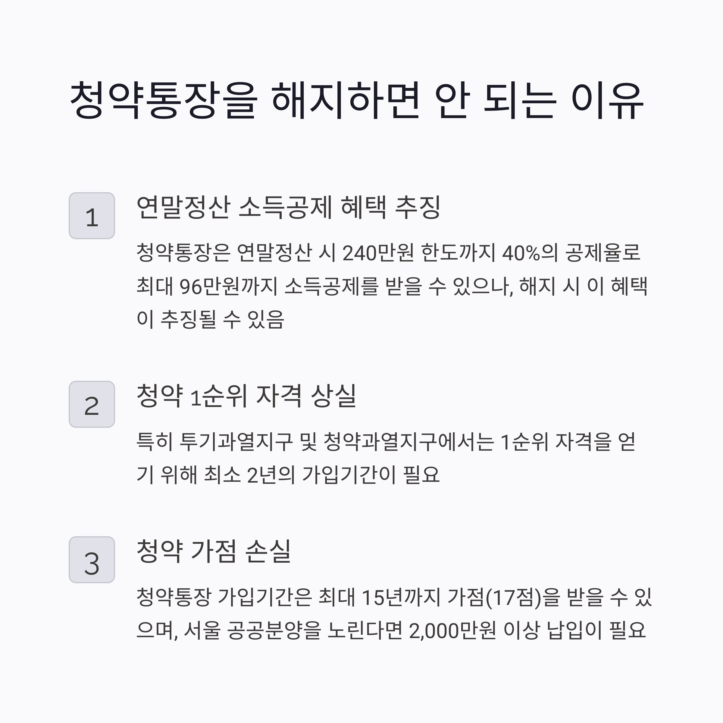 청약통장은 연말정산 시 240만원 한도까지 40%의 공제율로 최대 96만원까지 소득공제를 받을 수 있어요. 하지만 소득공제 혜택을 받은 후 청약통장을 해지하면 이 혜택이 추징될 수 있어요.