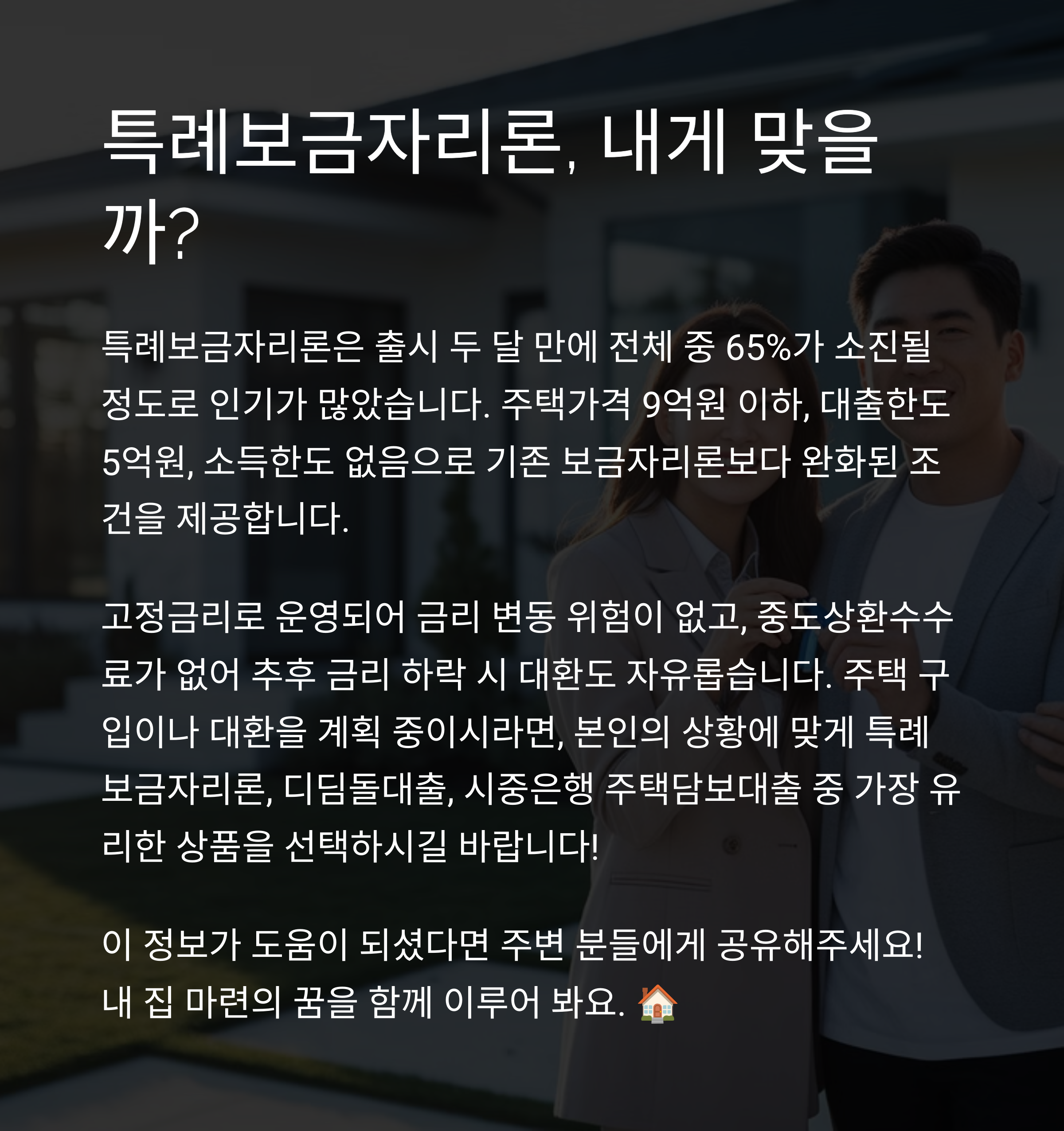 주택 구입이나 대환을 계획 중이시라면, 본인의 상황에 맞게 특례보금자리론, 디딤돌대출, 시중은행 주택담보대출 중 가장 유리한 상품을 선택하시길 바랍니다! 😊