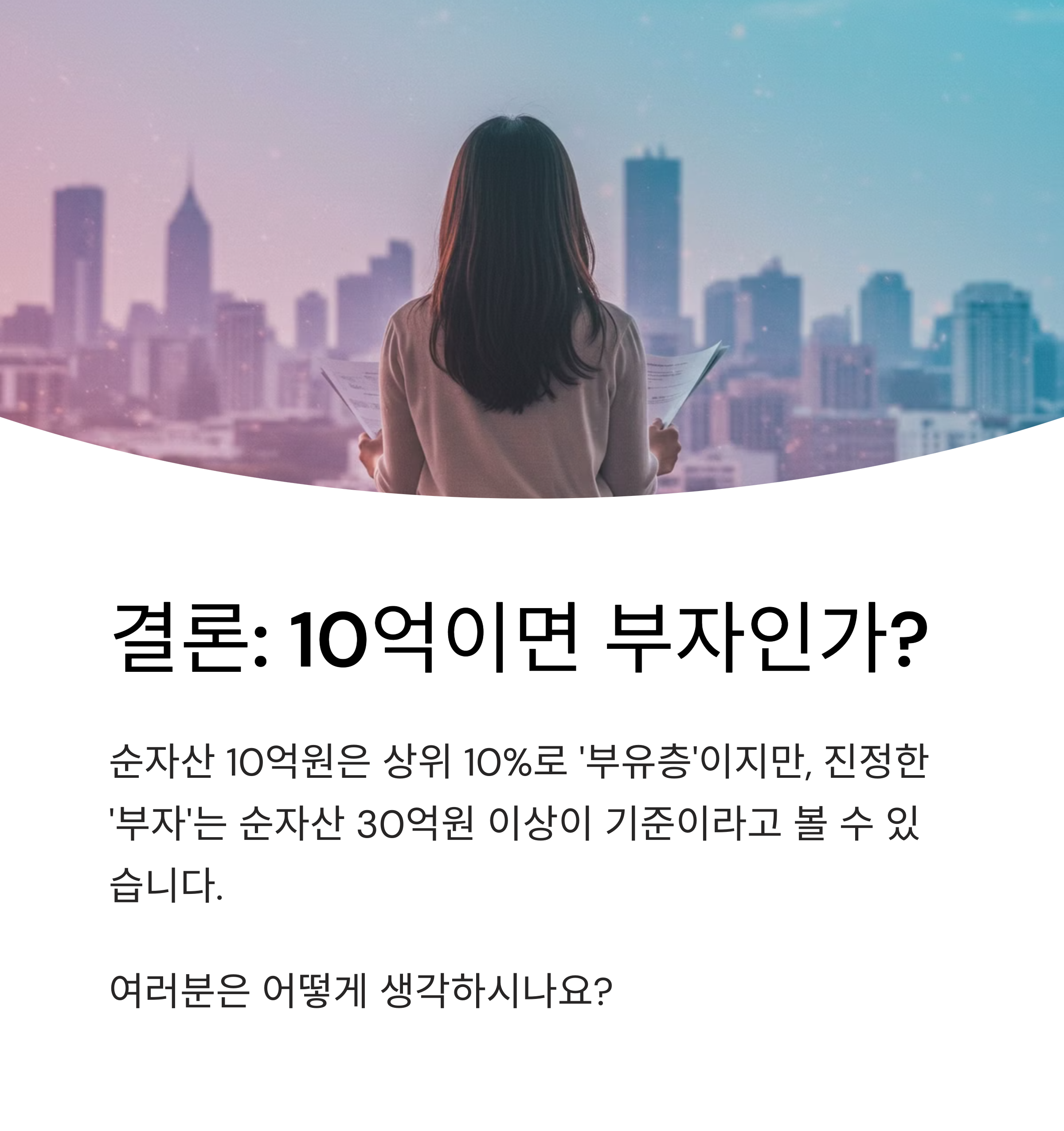 순자산 10억원은 한국에서 상위 10%에 근접한 수준으로, '부유층'이라고 볼 수는 있지만 금융권에서 정의하는 '부자'의 기준으로는 최소한의 진입점이라고 볼 수 있어요.
