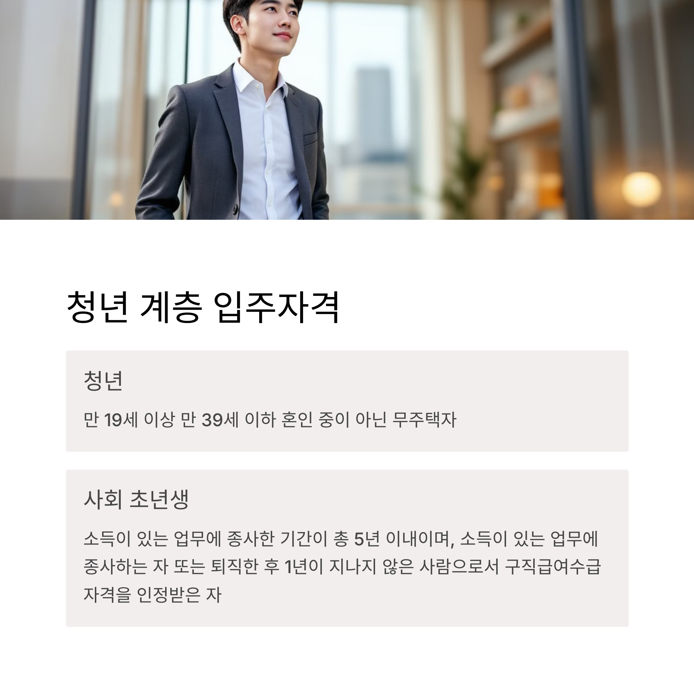 - 청년: 만 19세 이상 만 39세 이하 혼인 중이 아닌 무주택자