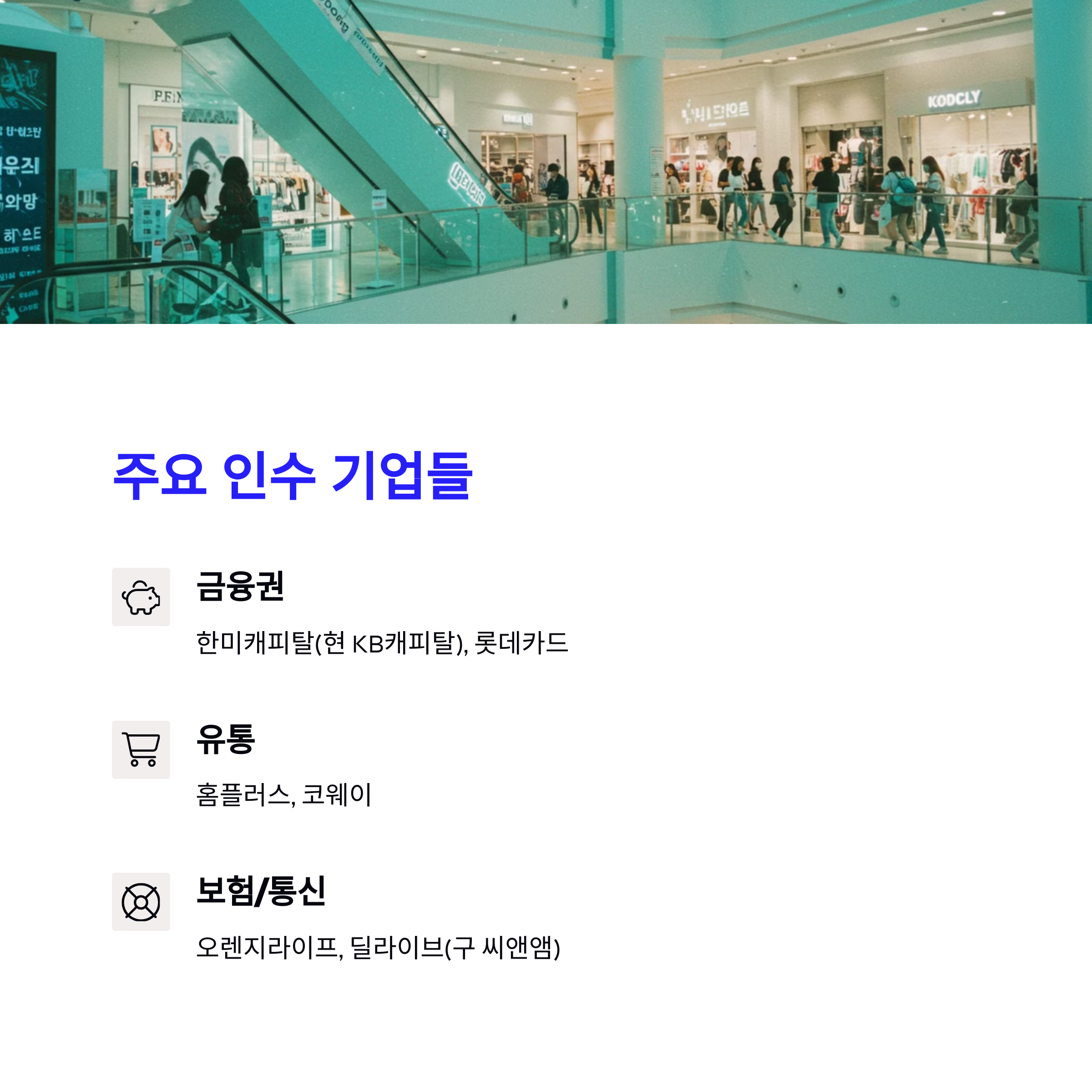 • 주요 인수 기업: 한미캐피탈(현 KB캐피탈), KT렌탈, 딜라이브(구 씨앤앰), 코웨이, 두산공작기계, 홈플러스, 오렌지라이프(구 ING생명, 현 신한라이프), 롯데카드 등