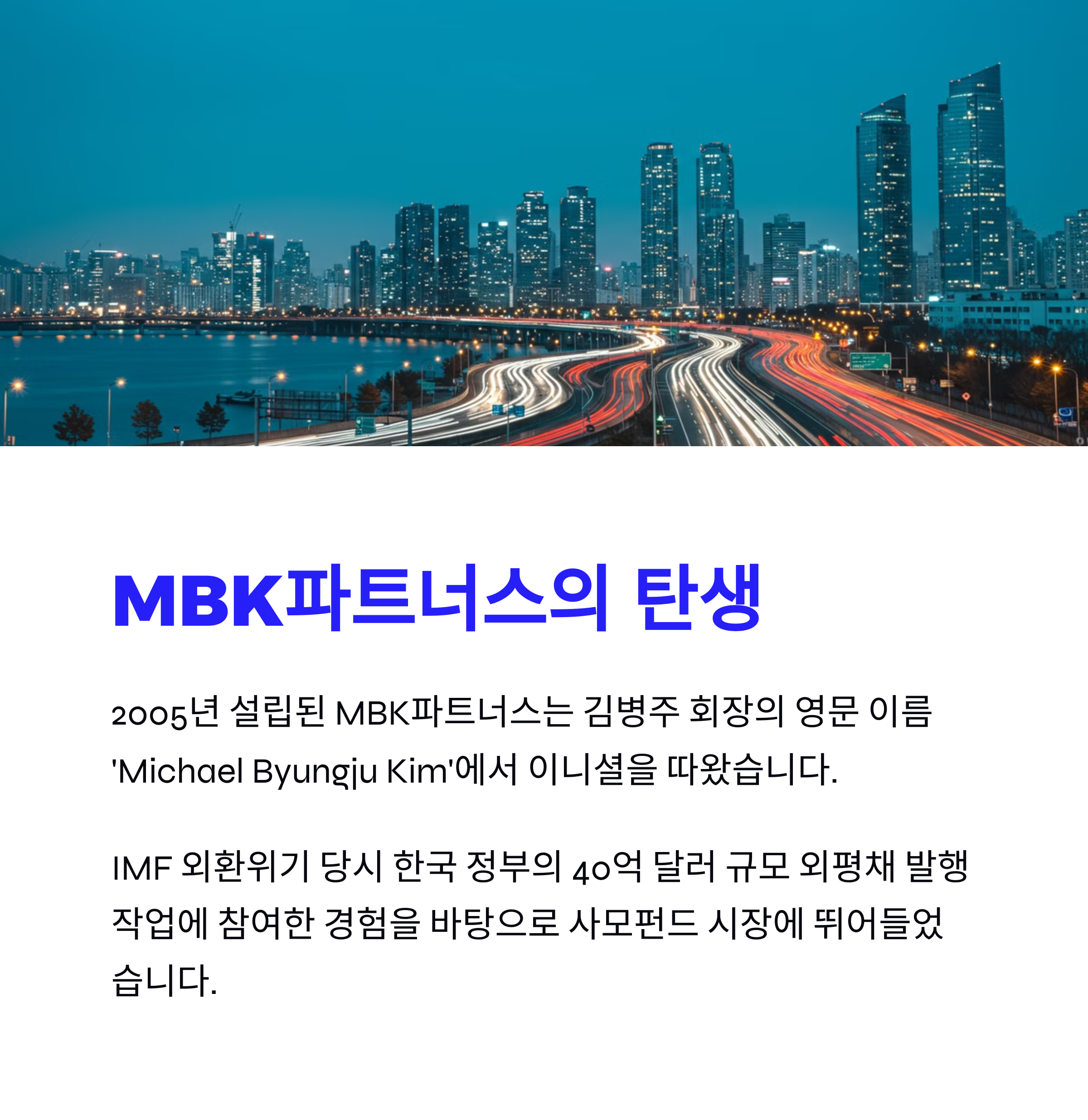 MBK파트너스는 김병주 회장의 영문 이름 'Michael Byungju Kim'에서 이니셜을 따온 사모펀드로, 2005년 설립 이후 아시아 최대 규모의 사모펀드 중 하나로 성장했습니다.