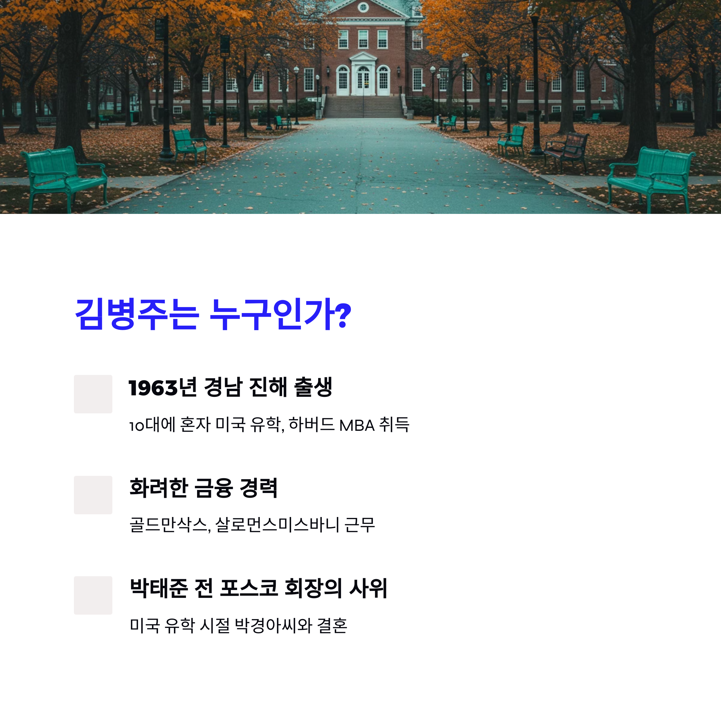 김병주 회장은 1963년 경남 진해에서 태어났어요. 10대 시절 혼자 미국으로 유학을 떠나 하버포드 칼리지에서 영문학을 전공하고, 하버드대학교 경영대학원에서 MBA 과정을 마쳤습니다.